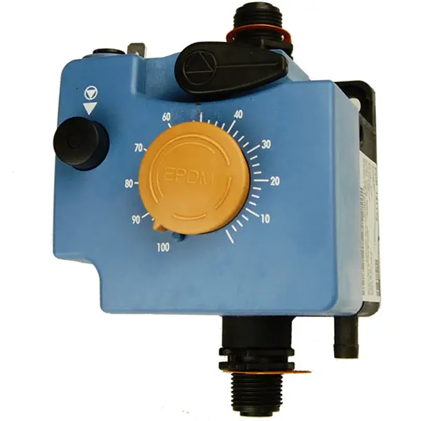 This high-quality replacement detergent pump is specifically engineered for the precise delivery of cleaning agents in robotic milking systems. The orange housing serves as a clear visual indicator for correct installation and chemical routing.